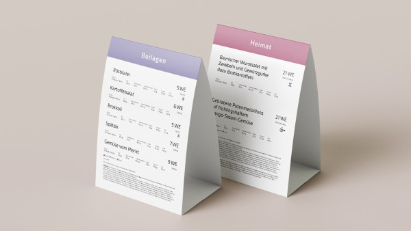 Im Rahmen des Speiseplansystems haben wir ein Menülinienkonzept mit eigener Farbwelt entwickelt. Dieses Konzept erleichtert den Gästen die Orientierung in der Kantine erheblich.