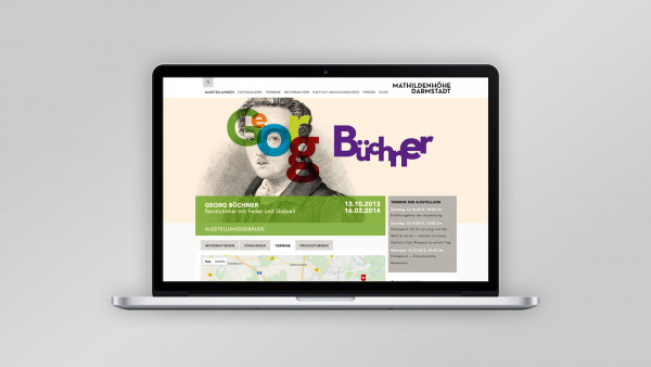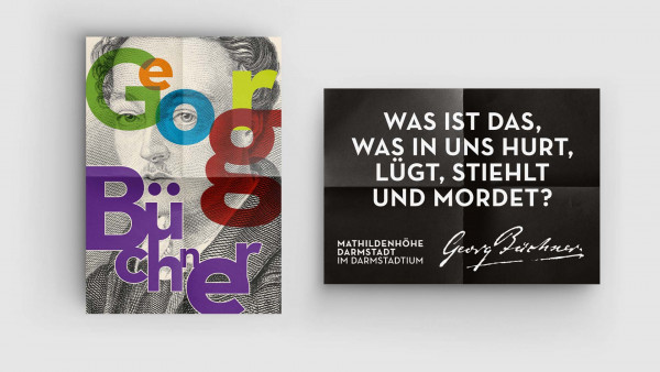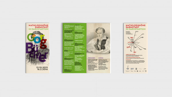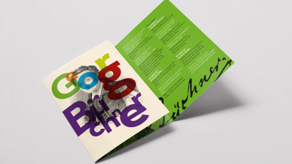 Das Ergebnis ist ein Designkonzept für die „Georg Büchner“ Ausstellung, das mit großen bunten Buchstaben sowie Zeichnungen und Zitaten des Autors spielt. Für die Ausstellung wurde ein Key Visual entwickelt und für alle Kommunikationsmedien umgesetzt.