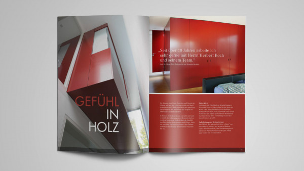 Die Schreinerei Koch wünschte sich ein moderneres Erscheinungsbild, das sowohl für Print als auch für den Online-Auftritt des Unternehmens funktioniert. Farbgebung und Typographie sollten das hochwertige Material perfekt inszenieren und in den Fokus rücken.